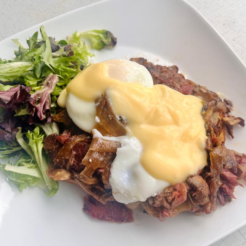 Toasted marble rye topped with house-braised corned beef, caramelized onions, sautéed mushrooms and hollandaise sauce.