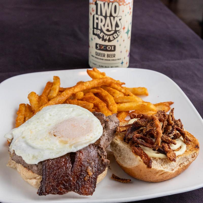 A big beef burger topped with an over easy egg, brown sugar bacon, crispy onion straws and house made hollandaise aioli .