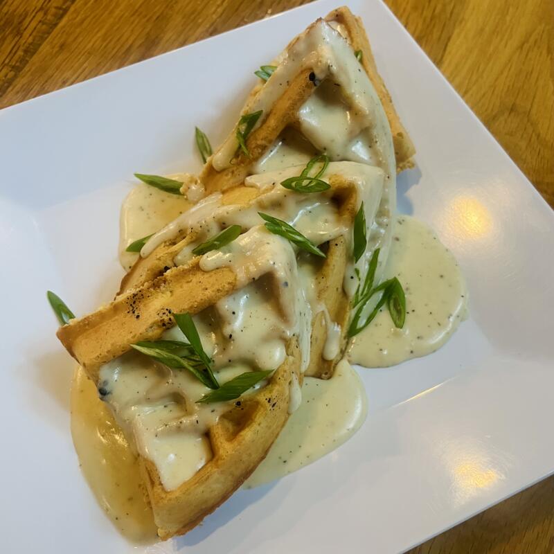 Our Belgian waffle covered in a house-made chicken country gravy. Served w/ Yeaney’s PA maple syrup