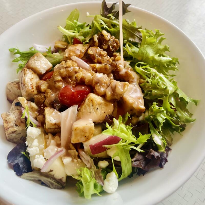 Mixed greens with candied walnuts, red onion, tomato, craisens, goat cheese, apples, pears, and fire braised chicken. Served with a side of citrus champagne vinaigrette