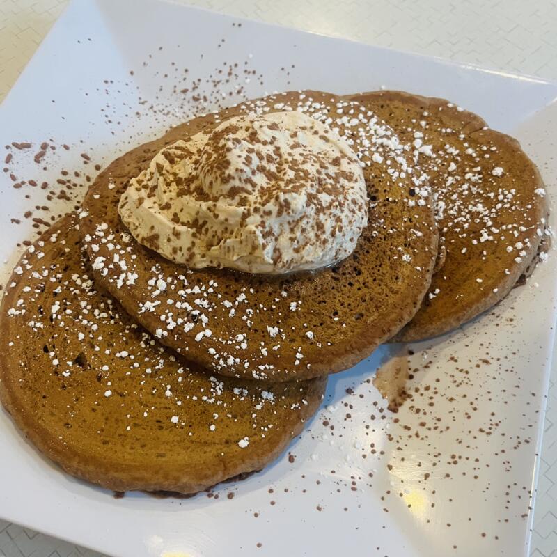 Buttermilk espresso pancakes topped with tiramisu mascarpone cream, cocoa powdered sugar, and served with Yeaney’s PA maple syrup