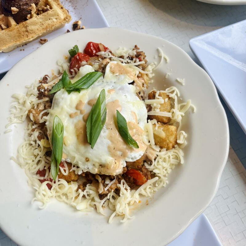 House made chorizo with onions & tomatoes over tater tots. Topped with shredded cheddar, an over easy egg, green onion and a drizzle of chipotle pepper aioli