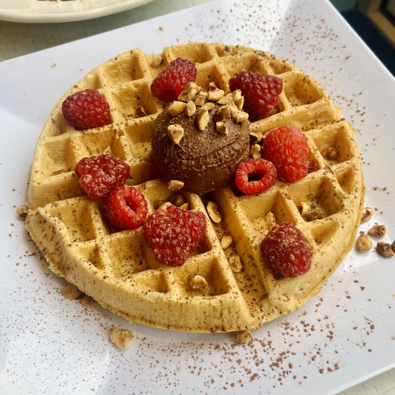 Our Belgian waffle topped with a Nutella mascarpone crème, chopped hazelnuts, fresh raspberries, and cocoa powder. Served w/ Yeaney’s PA maple syrup