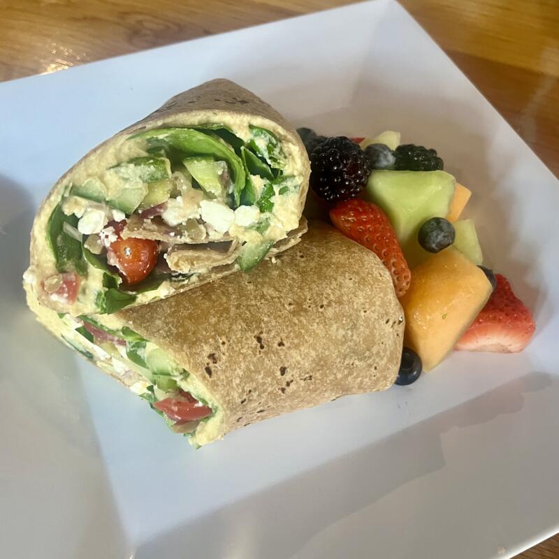 Large Flour tortilla stuffed w/sautéed onions, peppers, mushrooms, scrambled ‘ZERO EGG’, plant-based Italian sausage & cheddar; served w/salsa on the side