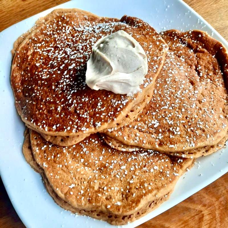 Carrot cake buttermilk pancakes topped with cream cheese icing and powdered sugar; served with Yeaney's 100% PA maple syrup
