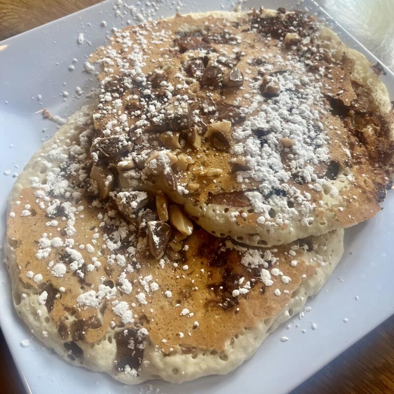 Three buttermilk pancakes filled with toffee chips and bacon. Topped with more toffee chips, powdered sugar, and served Yeaney's PA Maple syrup